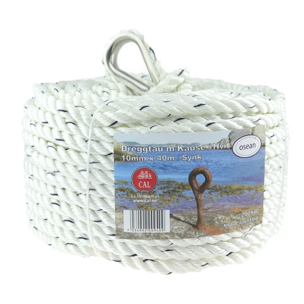 Tau fortøyning med øye 10mm X 6m Hvit m/blå tråd. 3-Slått Polyester