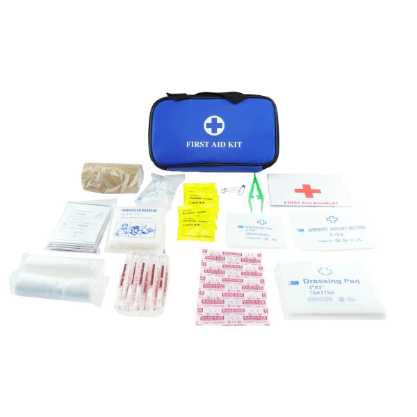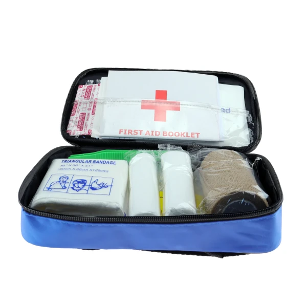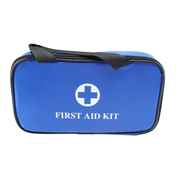 Inneholder et bra utvalg plaster, bandasjer, saks, pinsett, termometer osv.