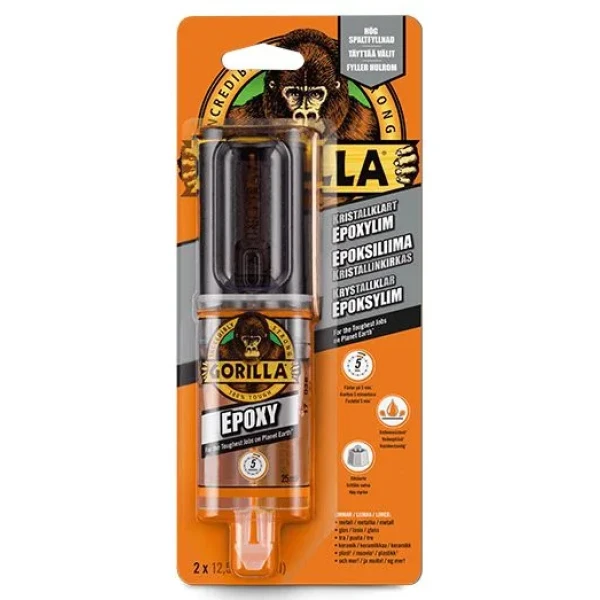 DEN KRYSTALLKLARE, TODELTE EPOXYEN SOM FYLLER SPREKKER.Gorilla Epoxy gir et sterkt, langvarig feste til reparasjoner både i hjemmet og på bilen. Den brukervennlige sprøyten påfører en lik mengde harpiks og herdemiddel. Når de blandes sammen, skapes et permanent, holdbart og vannbestandig feste.Den todelte Gorilla Epoxy-formelen til fylling av sprekker, herdes på 5 minutter og fester lett stål, aluminium, glass, tre, keramikk, flis og de fleste typer plast (Anbefales ikke til bruk på polyetylen eller polypropylenplast eller lignende materialer)I tillegg tørker den krystallklart og sørger for at prosjektene dine er uten flekker.Krystallklart når det tørkerIdeell for ren, enkel finish.Fyller sprekkerFyller tomrom og festes til ujevne og vertikale overflater.Festetid fem minutterGir nok tid til å justere posisjonen for perfekt tilpasning.VannbestandigTåler moderat eksponering for vann.Brukervennlig sprøyteSeparate sylindre med harpiks og herdemiddel forhindrer at harpiksen herdes. Sprøyten påfører jevnt og inkluderer en hette for flergangsbruk.