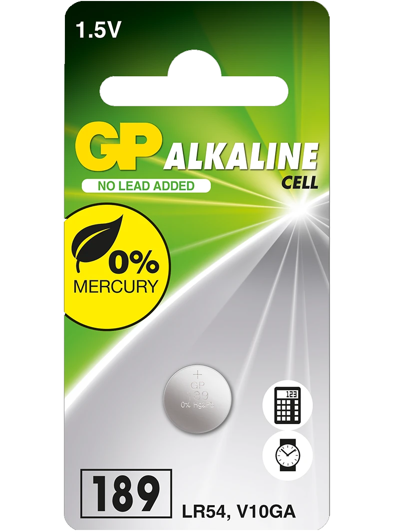 Alkalisk batteri fra GP batteries. Inneholder ikke bly eller kvikksølv. Passer diverse klokker, fjernkontroller, backup minne, leketøy, kalkulatorer, termometre etc. Kalles også: SR1130W, SR54, AG10, SB-BU, G10, 280-15, GP189, M, V389, D389, 626, S1131E, V10GA, LR55, GP389, LR1130, 389, 189