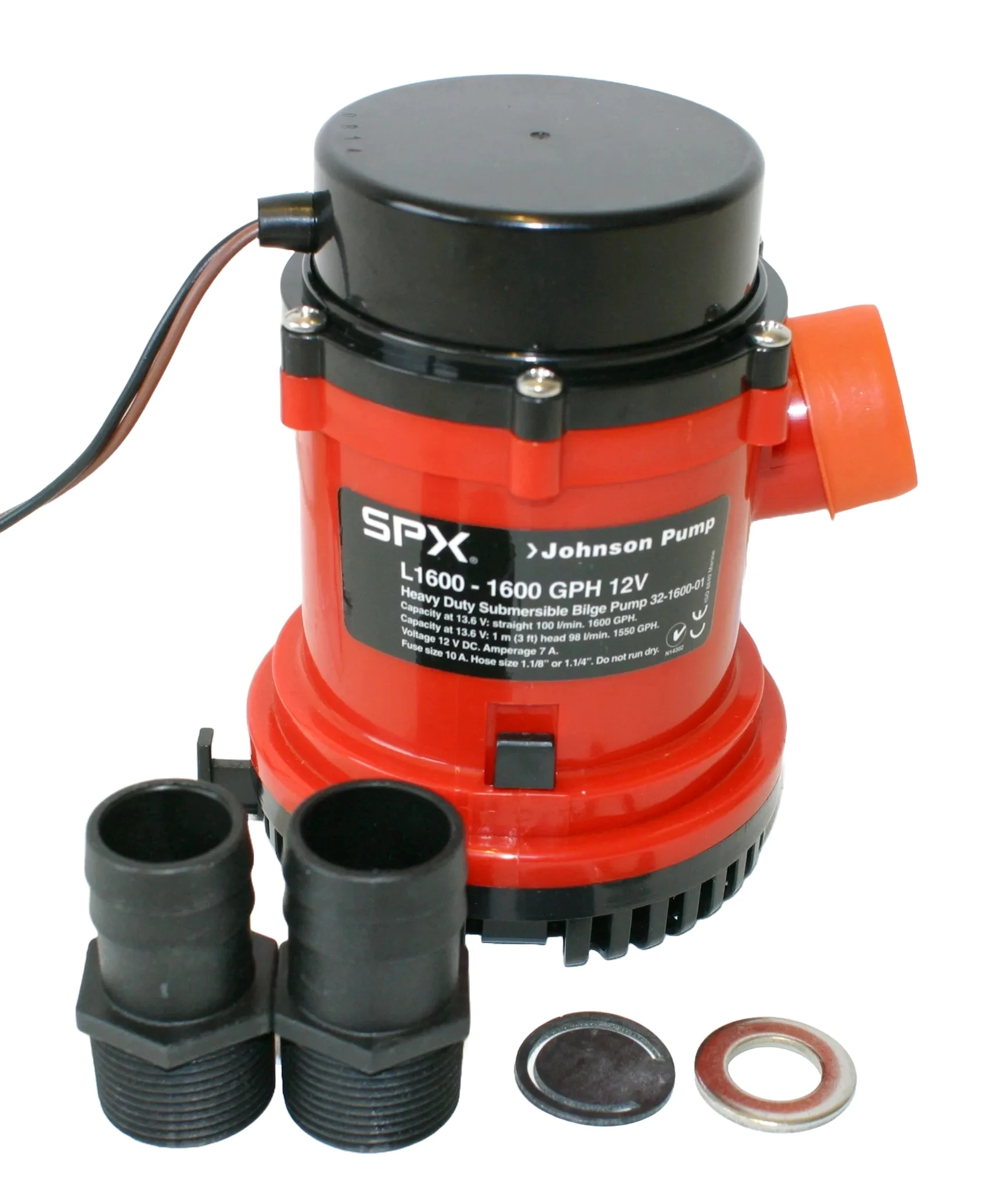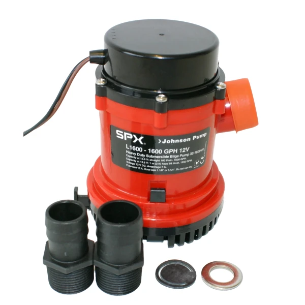 Nedsenkbar lensepumpe av høy kvalitet fra SPX Johnson Pump.Høy kapasitet og lavt strømforbruk. L-1600 er en pumpe konstruert for å oppfylle de høyeste krav til driftsikkerhet og kapasitet. Tilfredsstiller ISO 8849. Egnet til yrkesmessig bruk i f. eks fiskebåter og andre steder der det stilles høye krav. Vannkjølt, 12-polt motor med doble kulelager, sikrer jevn og stabil gange over mange år. Leveres med 1,8m tilkoblingskabel, samt to tilkoblingsnipler (1 1/8 + 11/4″)Pumpehuset kan enkelt demonteres for rengjøring. Slangetilkobling: 11/8″ (29mm) og 11/4 (32mm)Kapasitet:100 liter/min (1600gph) v/ fritt utløp (6000ltr/t) 98 liter/min (1550gph) v/ 1m løftehøyde. Dim: 108mm Ø x 149mm HSpenning: DC 12V 7A Pumpene kan enkelt påmonteres automatisk nivåbryter. NB! Finnes også i 24v versjon: Varenr 372457