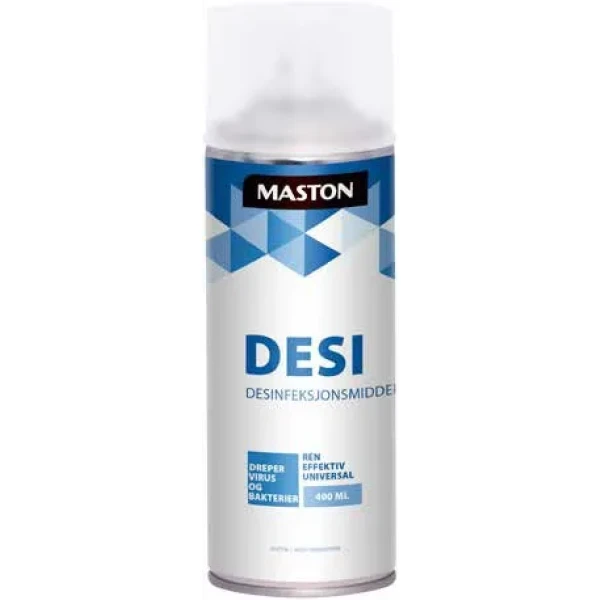 MASTON DESINFEKSJONSMIDDEL dreper effektivt bakterier, virus, gjærsopp og det meste av mugg på mange overflater. Produktet desinfiserer dørhåndtak, toalettseter, kraner og mange andre gjenstander som vanligvis inneholder mikrober. Klar til bruk. pH 7. Alkoholinnhold 70% (etanol). Ingen duft/parfyme, ingen fargestoffer.