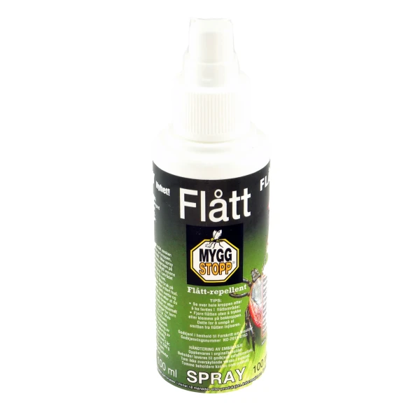 MS Flåttspray Dokumentert effektiv beskyttelse mot flått. Langtidsvirkende mot flått og insektstikk i 6-12 timer. Best i test i studier mot DEET baserte produkter. Godkjent i EU og USA. Brukes også mot stikkende -og bitende insekter i tropiske strøk. Brukes også mot mygg som overfører Zika viruset. Anbefalt av WHO MYGGSTOPP- Flått sprayes på hud og klær. Smøres ut på huden til ett tynt lag, på de hud-områdene som skal beskyttes. Unngå å spraye på silke og finere klær . Anbefales å brukes med forsiktighet til barn og gravide. Bør ikke brukes til barn under 3 år.
