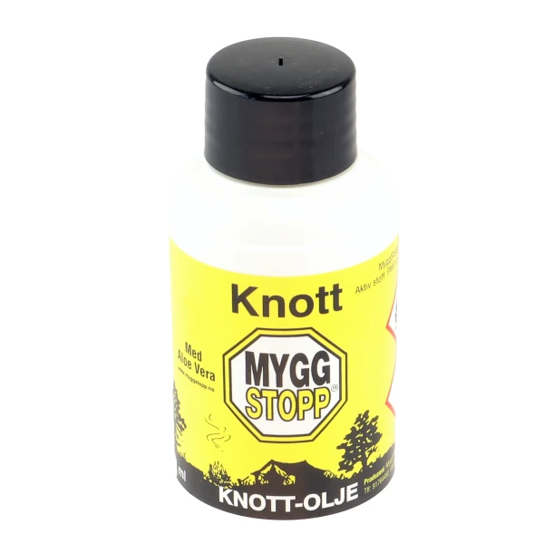 MYGGSTOPP – Knottolje 50 ml med ALOE VERA Denne varianten inneholder oljer, som gjør den svært lett å smøre ut. MYGGSTOPP-Knottolje danner en tett film på huden. Dette sikrer 100 % kort- og langtidsbeskyttelse. En liten hensiktsmessig flaske , som du lett kan ha med deg på alle slags turer i fjellet, i skog og mark. Dette er virkelig klassikeren som mange etterspør. Ved aktiviteter og under anstrengelser holder oljen lenger enn andre myggmidler. MYGGSTOPP – Knottolje er eneste i sitt slag på markedet i dag. Beskyttelse og virkning Virker ved å ta bort den ” utstrålingen ”, fra menneskers hud , som gir knotten appetitt på ditt blod. Dette kalles også repellerende effekt. Knottens radar virker ikke normalt lenger , og knotten setter seg ikke på hudoverflaten.Her har oljen sin store fordel ved at den ” holder lenge ”. Oljen kan du bruke mot mygg , knott og andre stikkende insekter. Beskytter også mot flått og malariamygg. Hjelper også litt mot tunflua ,svartfluer og klegg ( 1 time ) Effekt Oljen har en konsentrasjon av virkestoffer som gir maksimal effekt og – ikke minst – langtidsbeskyttelse. Du trenger ikke gjenta behandlingen etter anstrengelse etc. Effekten varer normalt i 6 timer ( Også ved aktiviteter ) Duft Oljen gir en myk og smidig overflate med duft av sitron. Parfymen har også repellerende effekt. Bruk Smøres enkelt ut til ett tynt lag ( en tynn film eller hinne på huden ) Effekten reduseres ikke om du tar klær utenpå hud som er beskyttet med MYGGSTOPP-Knottolje. ( Se bruksanvisningen på produktet ) Oljen er meget drøy i bruk. Oljen gjør huden myk og smidig. Inneholder Aloe Vera som er svært hudvennlig.