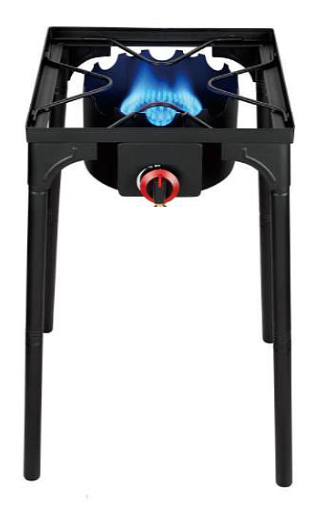 Stabil og god gassbrenner på stativ, for bruk utendørs med husholdningsflasker (Propan/LPG 2kg/5kg/10kg/11kg). Brenneren i støpejern har en trinnløst justerbar effekt opp til 3800w (13000BTU). Piezo elektronisk tenning for enkel opptenning. Det følger med 4 stk avtagbare ben + 4 mellomstykker. Du kan derfor enkelt velge arbeidshøyde v/bruk av enten ett ben (48cm) eller ben + mellomstykke (78cm). Stativet er laget i pulverlakkert stål. Perfekt som ekstra gasskoker til utekjøkkenet, f. eks sammen med gassgrillen. Den store overflaten på hele 43x40cm gjør kokeren egnet til både wok og større stekepanner/gryter. Lav arbeidshøyde er perfekt dersom du vil bruke brenneren til koking av skalldyr, tunge suppegryter osv, mens høy arbeidshøyde er glimende for wok og stekepanner.
