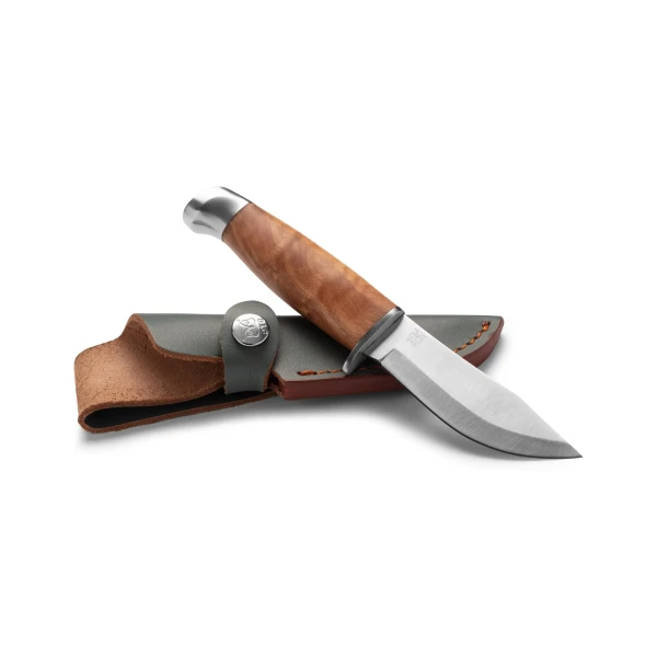 Kniven for junior med mindre skaft og knivblad og en solid fingerstopper, men med de samme gode egenskapene som Geilo slirekniv for voksne. Bladet er kon- og hulslipt og laget i høykvalitets 440 stål, som gjør at den holder seg skarp lenge og er lett å slipe opp. Skaftet er laget av slitesterkt oliventre og kniven kommer i en petroleumsblå lærslire for trygg oppbevaring.Bladlengde 9,5 cm, total lengde 19,5 cmVekt m/slire: 130grLeveres flott gaveeske