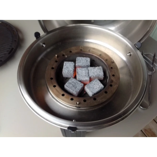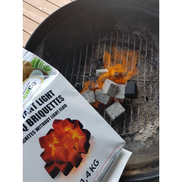 1. Ta det ønskede antall briketter ut av posen. 2. Antenn én enkel brikett. Etter ca. 10-15 sekunder begynner briketten å gnistre. Etter ca. 3 minutter er briketten klar. Legg grillristen på og forvarme denne i 5 – 7 minutter.