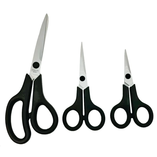 Praktisk sett med 3 stk husholdningssakser i rustfritt stål.