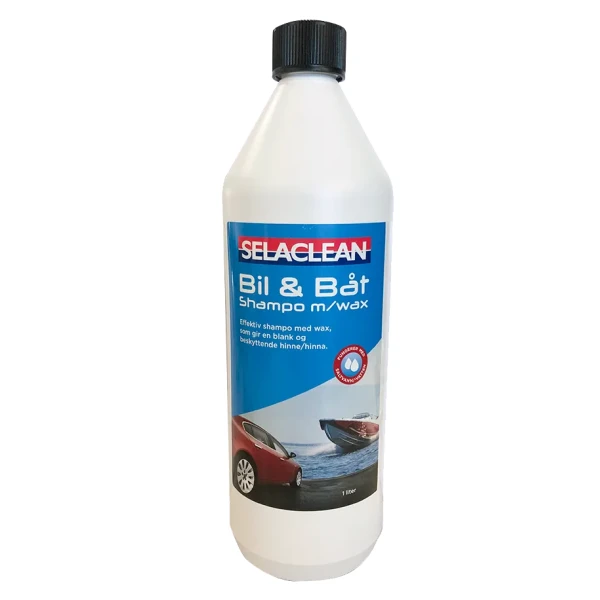 SELACLEAN BIL OG BÅTSHAMPO MED VOKS Shampokonsentrat som også inneholder carnauba voks. Det betyr at du både vasker og legger igjen et beskyttende lag voks samtidig. Fjerner olje, fett, veisalt, smuss og trafikkfilm. Den er skånsom, og skader ikke polerte flater. Rekker til 35-40 vask.Kan benyttes med saltvann, til båtvaskInnhold 1 ltr.