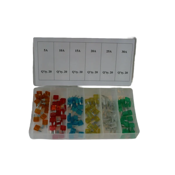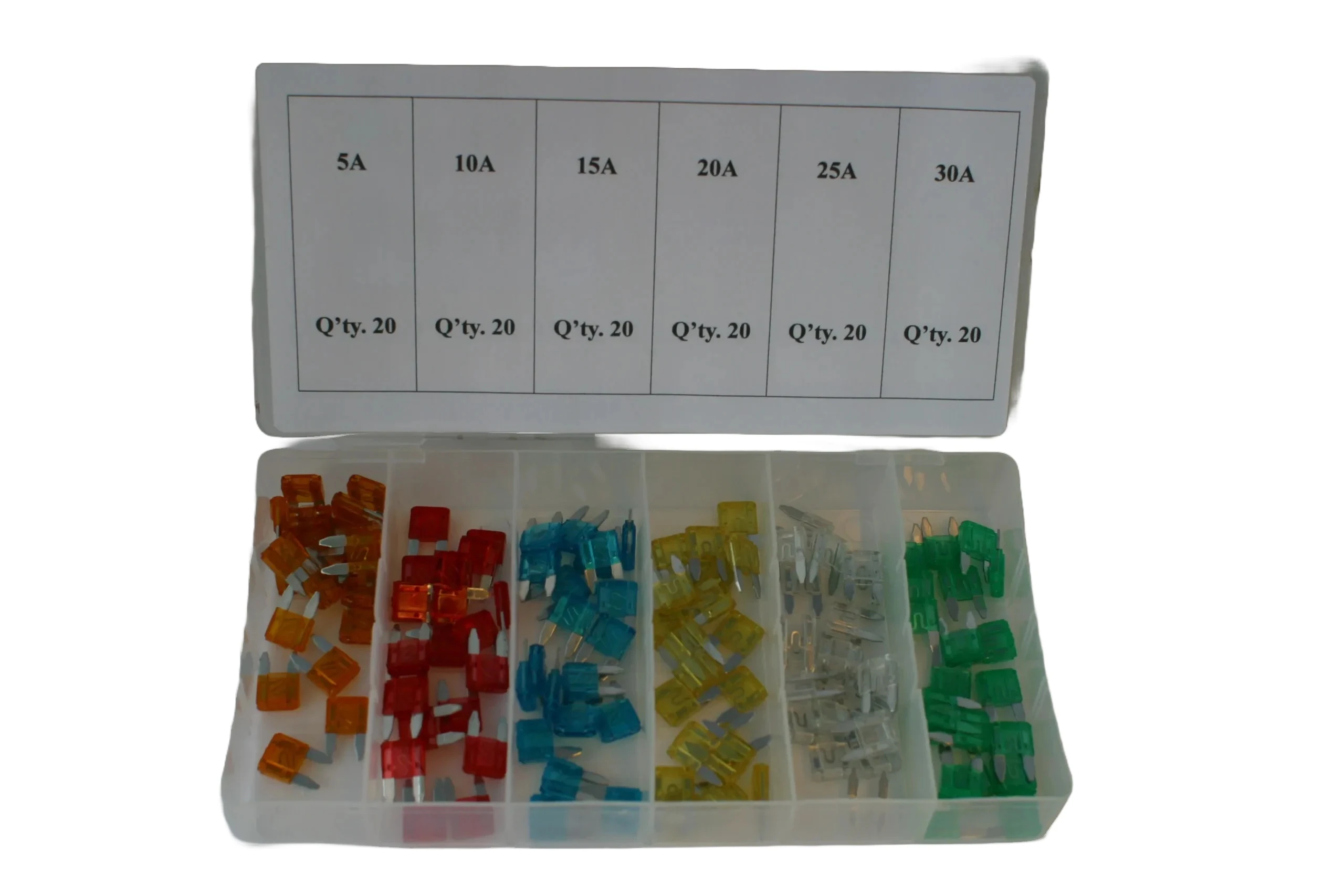 Sett med totalt 120 stk ass. MINI flatstikk sikringer med selv-test. Består av 20 stk av hver type 5A, 10A, 15A, 20A, 25A og 30A