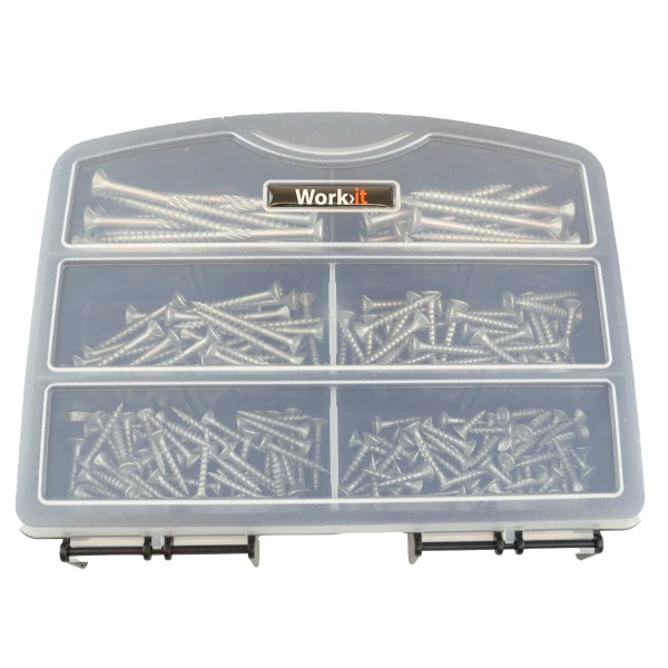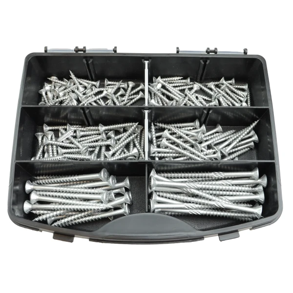 Sortimentsett som inneholder 220stk assorterte utendørsskruer, ruspert, matt grå overflate og forsenket hode med torx spor. Freseribber gir en fin finish. Testet og godkjent til 1000 SSH (timer i salt-tåke kammer)Inneholder: 60 stk. Ø3,5×20 mm50 stk. Ø3,5×25 mm40 stk. Ø4,0×30 mm30 stk. Ø4,0×40 mm20 stk. Ø5,0×60 mm20 stk. Ø5,0×80 mm