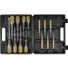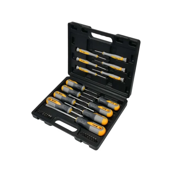 Settet inneholder rette skrutrekkere i størrelsene 4,0 x 75, 6,5 x 100, 8,0 x 150 mm, Phillips skrutrekkere i størrelsene PH11 x 75, PH2 x 100 mm, Pozidrive skrutrekkere i størrelsene PZ1 x 75, PZ2 x 100 mm, en bitsskrutrekker 6,3 x 50mm, og presisjonsskrutrekkere i flere størrelser. I tillegg inneholder settet en rekke bits i forskjellige størrelser og former.