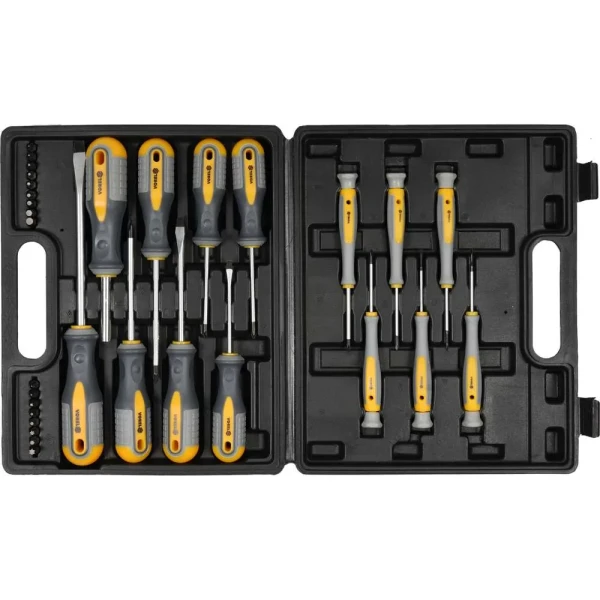 Vorel Skrutrekkersett er et komplett sett med 32 deler, inkludert et variert utvalg av bits. Dette settet er laget av CRV 6150 stål, kjent for sin robusthet og holdbarhet. Skrutrekkerne har behagelige, sklisikre håndtak, noe som gir et godt grep og kontroll under bruk. Settet leveres i en holdbar koffert, noe som gjør det enkelt å organisere og transportere.