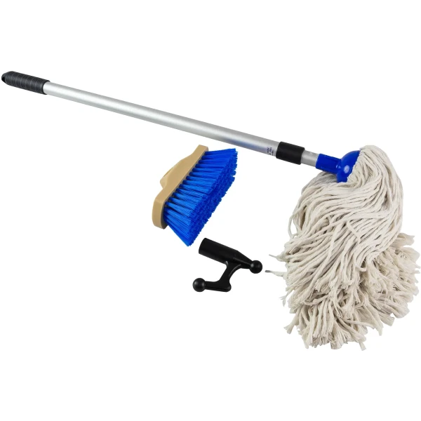 Rimelig vaskesett for båt og camping. Inkludert stuss for bruk som båtshake. Innhold: – Teleskopisk stang- Børste – Mopp- Båtshakestuss